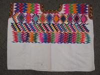 This post-1980 daily use huipil features a commercial manta cotton base. That base is decorated with hand embroidery, in this case using both polished cotton and synthetic threads. Across the back, that embroidery is done to look like brocade. The head and arm holes are intricately trimmed with hand embroidered designs and multi-colored chain stitching. Both of the lower panel edges are hemmed. Original adornment around the head-hole is retained. The stitching under the arm-holes, which makes this a usable garment, is still present.