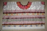 This contemporary ca. 2000 blusa incorporates these characteristics. The foundation fabric is synthetic commercial cloth. The design around the neck and chest were added using needle embroidery; this embroidery was also made using cotton thread. Other commercial ribbons of synthetic materials have also been added. The adornment around the head- and arm-holes is retained. The side stitching, which makes the huipil into a finished garment to be used, is still present.