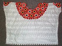 This contemporary ca. 2000 blusa incorporates these characteristics. The foundation fabric is synthetic commercial cloth. The design around the neck and chest were added using needle embroidery; this embroidery was also made using cotton thread. Other commercial ribbons of synthetic materials have also been added. The adornment around the head- and arm-holes is retained. The side stitching, which makes the huipil into a finished garment to be used, is still present.
