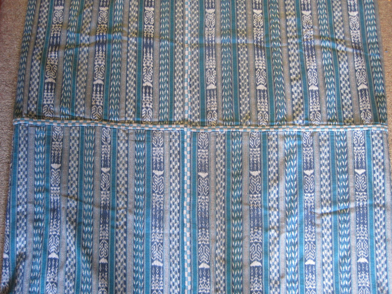 This skirt is of the second type -- made in Almolonga for use in Almolonga. It is of the style most popular in the late 1980s and 1990s. The fabric is cotton with a large proportion of indigo-dyed ikat. Overall size is 42 inches wide and 90 inches long if opened along the end seam. It consists of two panels each 21 inches wide and 90 inches long, which were then stitched together along the side to form the 42 x 90 skirt. The tube was then formed by sewing the ends together, resulting in a fabric of double thickness which is about 42x45 inches. In this case, all stitches are by hand and are of the decorative randa style. In the photos below, the second picture is a closeup of the first.