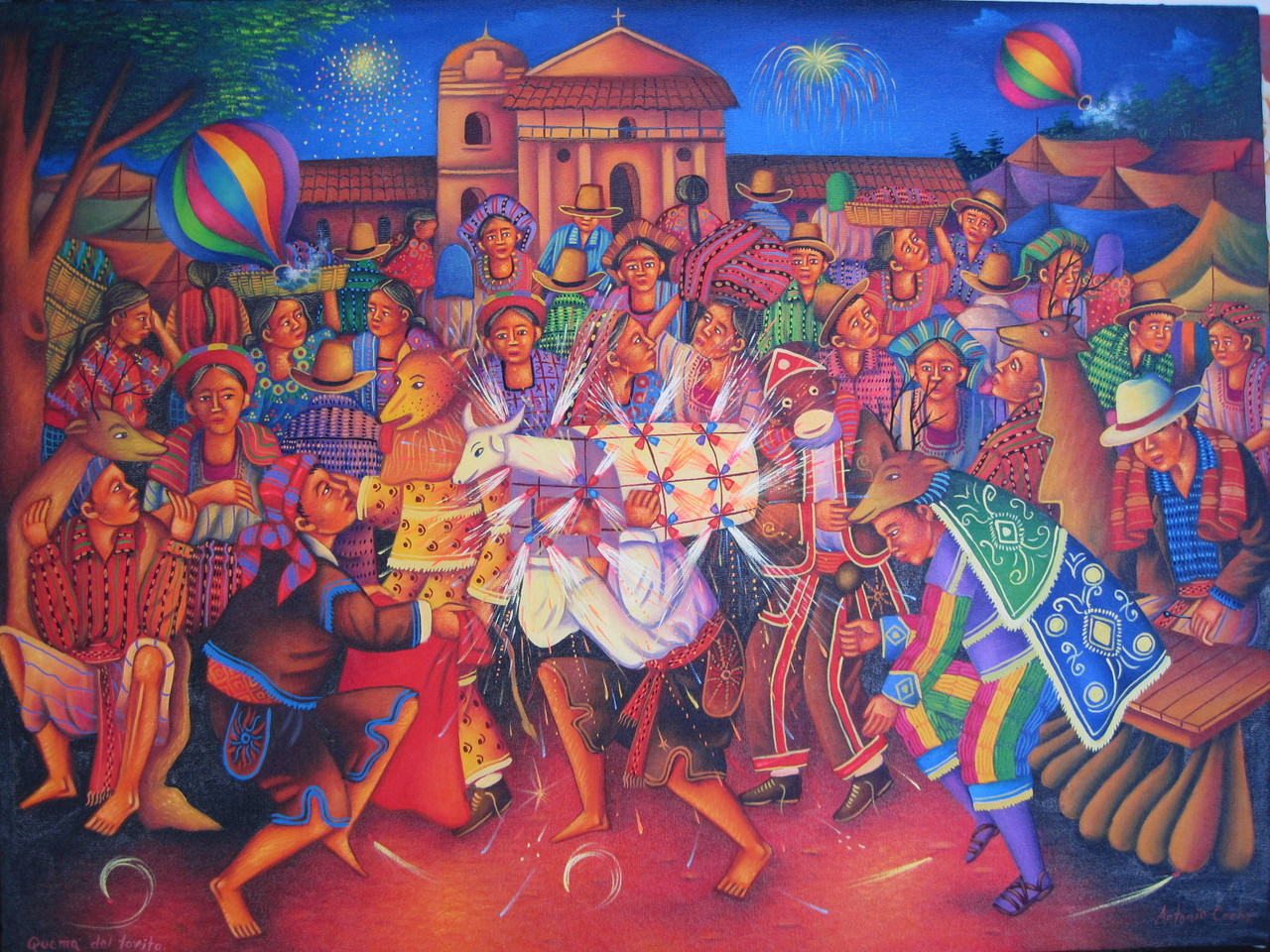 Oil painting on canvas measuring 32 x 24 inches, unstretched. The painting will be mailed rolled in a hard tube. Signed "Antonio Coche" in the lower right corner, titled "Quema del Torito" in the lower left corner. The painting depicts a traditional Tzutujil Maya celebration in the villages around Lake Atitlan, featuring a fake bull fight. It was painted ca. 20014. The images attached are of the entire painting, followed by close-up photos of different parts. After that are photos of the Mendoza gallery in San Juan and of Antonio and his wife Angelina in their sales room.