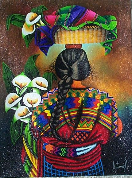 Oil painting on canvas measuring 10 x 13 inches, stretched but not framed. Signed "Antonio M." in the lower right corner. The painting depicts a local woman with lilies and a turket in her basket. It was painted ca. 2007, and was purchased in January 2008 in a gallery in Antigua. The slight glittering in the image is a result of photographic reflections off the texture of the paint.