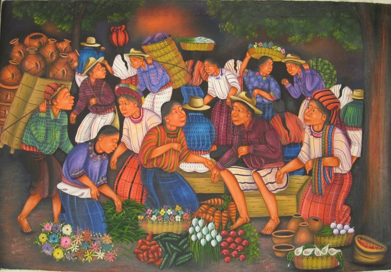 Oil painting on canvas measuring 23 x 34 inches, not stretched. Signed lower left "Jose Antonio pur Gonzalez"; Jose Antonio lives in one of the villages on Lake Atitlan. Titled lower center "Mercado de Noche Atitlan", this painting depicts "Night Market in Atitlan". In the past, there was a night market in the town of Santiago Atitlan. This painting will be shipped in a roll. The last two images below show the two halves of the painting in closer perspective -- first the left and then the right halves of the painting.