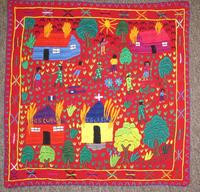 The civil war in Guatemala during the 1970s through the mid-1990s decimated the indigenous Maya population in many parts of the country. The village of San Andres Semetabaj is a very traditional Maya town located on a shelf of land high above Lake Atitlan. This town was particularly traumatized by the army during this period. These embroideries are of contemporary manufacture, and were woven and embroidered by hand by women in a weaving cooperative in San Andres. Each is signed by the woman in embroidery on the reverse side. Through their embroideries, they tell their stories of violence and murder at the hands of state violence by the Guatemalan government.