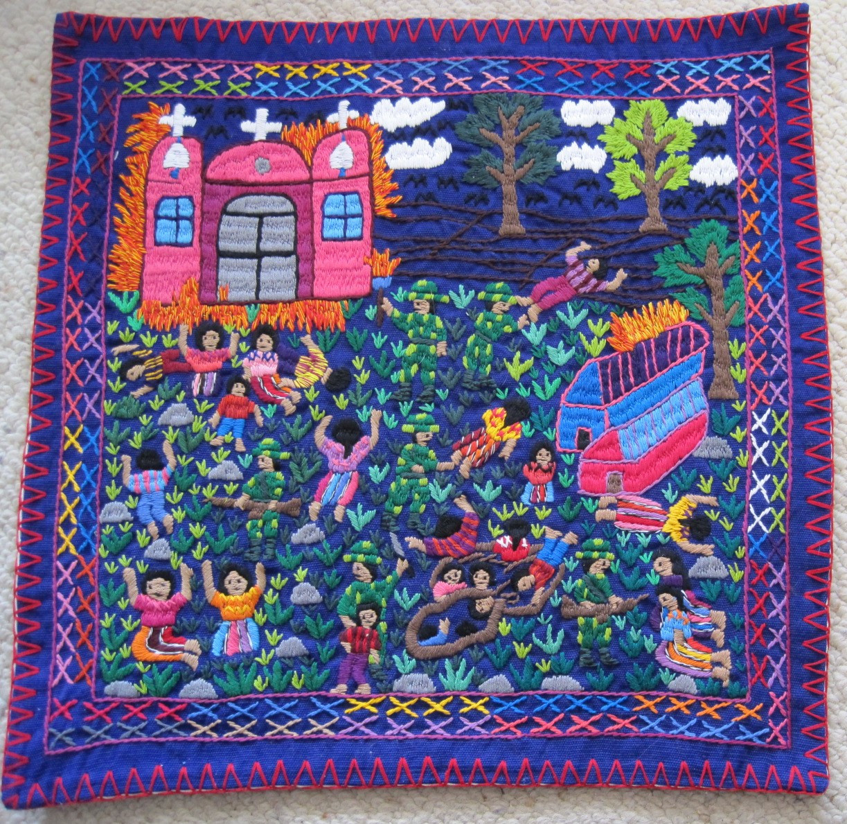 The civil war in Guatemala during the 1970s through the mid-1990s decimated the indigenous Maya population in many parts of the country. The village of San Andres Semetabaj is a very traditional Maya town located on a shelf of land high above Lake Atitlan. This town was particularly traumatized by the army during this period. These embroideries are of contemporary manufacture, and were woven and embroidered by hand by women in a weaving cooperative in San Andres. Each is signed by the woman in embroidery on the reverse side. Through their embroideries, they tell their stories of violence and murder at the hands of state violence by the Guatemalan government.