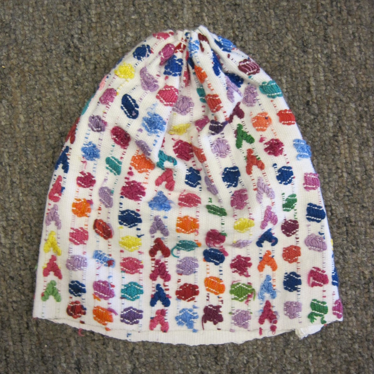 This child's gorra was woven in a single panel on a backstrap loom. It is from the Maya town of San Pedro Sacatepequez, located near the ancient colonial capital of Antigua in southern Guatemala. It is still sewed together as used. It measures 7.8 inches wide and approx. 6 inches in diameter. One end is selvage-finished, the other is hemmed. Condition is Very Good, perhaps with some slight soil. Age is approximately 5-10 years, purchased in 2019. The pictures below are of the two sides.