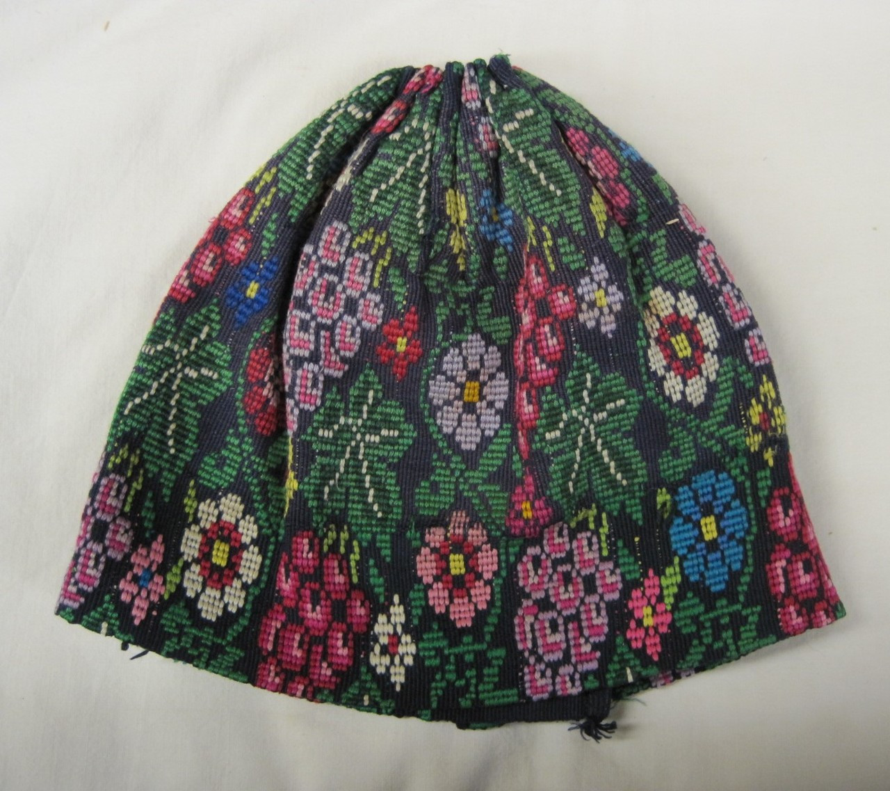 This child's gorra was woven in a single panel on a backstrap loom. It is from the Maya town of Tecpan, located near the ancient colonial capital of Antigua in southern Guatemala. It is still sewed together as used. It measures 7.8 inches wide and approx. 6 inches in diameter. All edges of the panel are selvage-finished. Condition is Very Good, perhaps with some slight soil. Age is approximately 5-10 years, purchased in 2019. The pictures below are of the two sides. The final photo shows how the supplemental weft of the design floats on the inside of the closed hat. This example is unusual in that the entire exposed surface of the finished hat is covered in brocaded design.