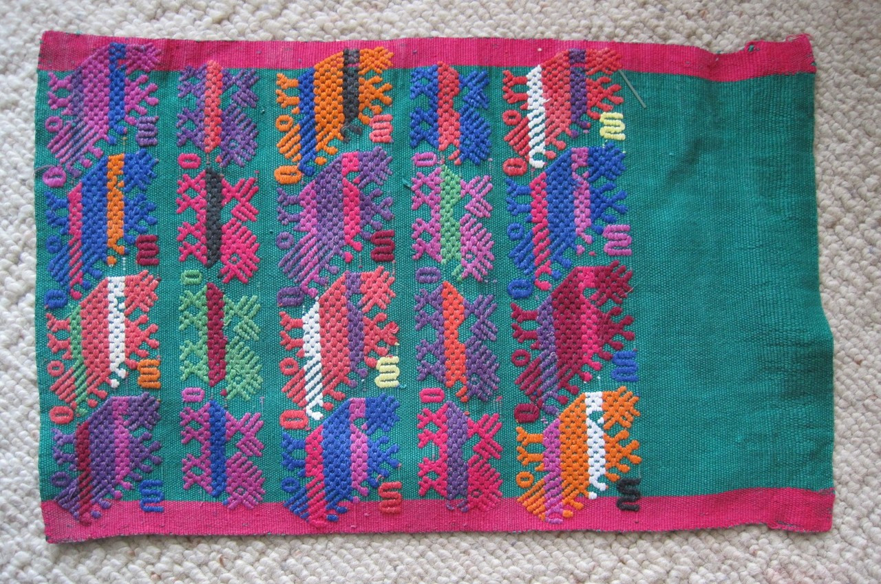 This tzute was woven in a single panel on a backstrap loom. The person from whom I bought it told me it was from Chuarrancho, located in the department of Sacatepequez, near the ancient colonial capital of Antigua in southern Guatemala. It measures 11.5 inches wide and 18.5 inches long. Both ends are selvage-finished. Condition is Very Good, with some light soil and a few pulled threads. This textile was purchased in 2019.