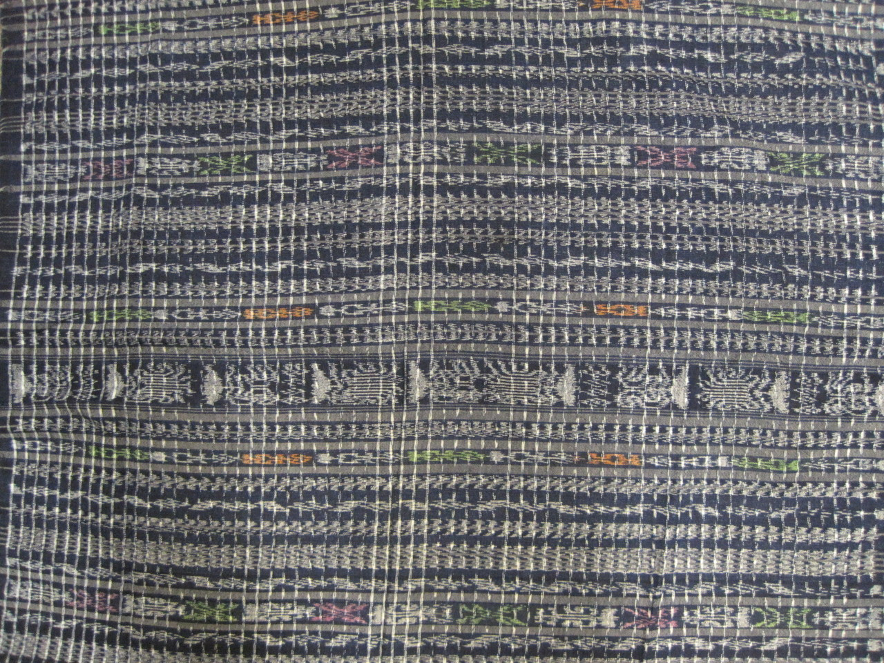 This skirt is a single panel of finely woven material featuring ikat or jaspe designs in the weft direction. The sides of the cloth are very nicely selvage-finished, and the ends have been hemmed and have been stitched together to form the tube. Overall size is 34 inches wide and 114 inches long. The weave is weft-faced plain weave with simple but very fine weft-ikat figures. This material appears to be 100% cotton. In the photos below, the second is a closeup of the first. In both pictures, the weft is in the horizontal direction. Because of the camera, the fabric is actually a true indigo blue that is different from the grayish color shown.