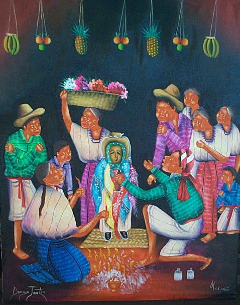 Oil painting on canvas measuring 16 x 20 inches, stretched. Signed by the artist "Domingo Jonatan" in the lower left, titled "Maximom" in the lower right. Maximom is a folk saint locally worshipped in Santiago Atitlan. Paintings of this subject have recently become quite uncommon, with the growing influence of Christian Evangelicalism in the towns around the lake. This painting is quite detailed and a very interesting treatment, with men, women and children all taking part in the worship. Note also the two small bottles of the local firewater on the floor in the foreground. Drinking this high-potency brandy is often a part of the worship service.