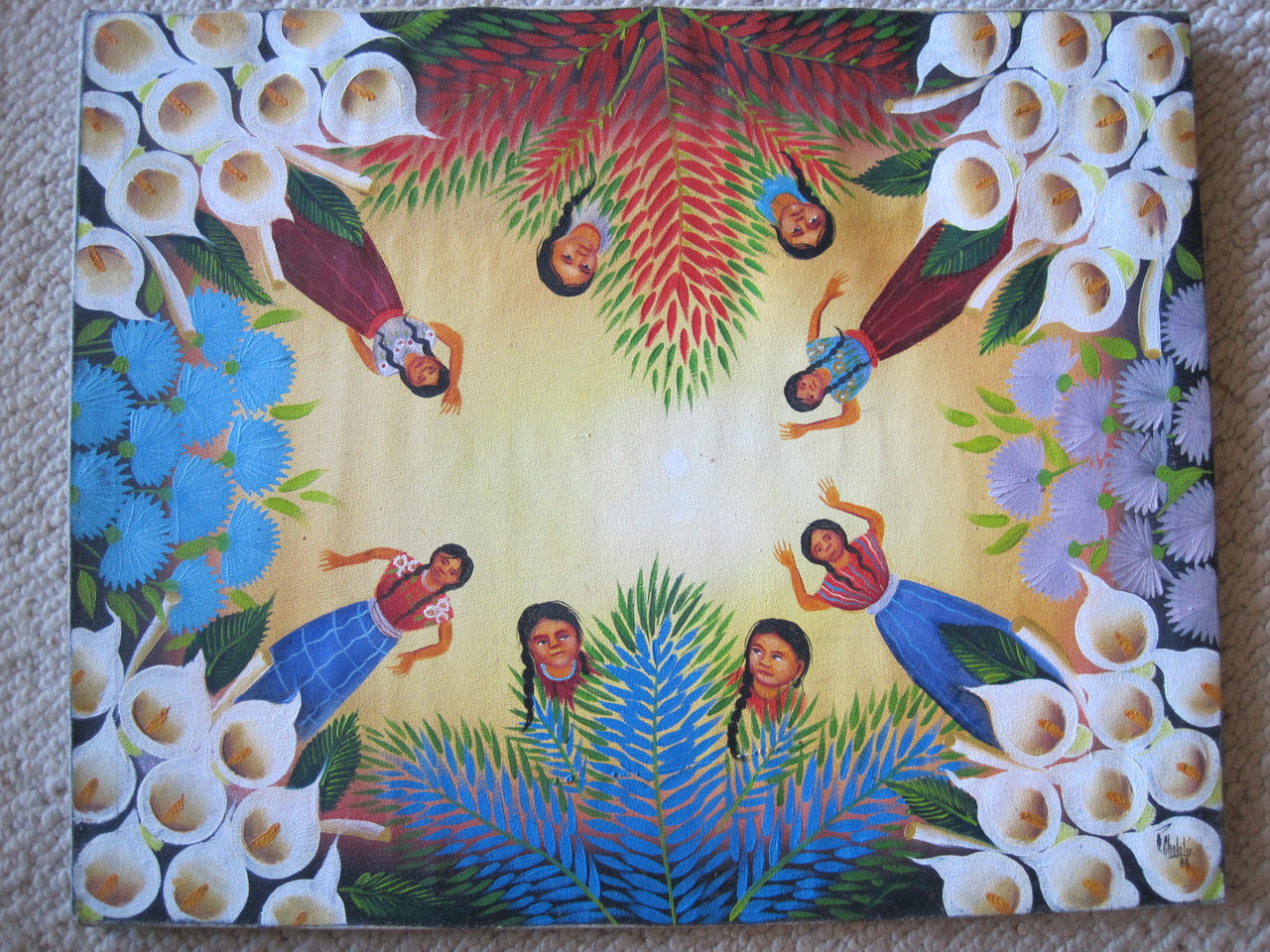 Oil painting on canvas, measuring 16 x 20 inches, stretched. Signed lower right with the monogram of Elmer Cholotio, a Maya artist who lives in Santiago Atitlan on Lake Atitlan. Elmer is a talented contemporary artist who paints in many styles. This painting was bought in 2020 in a gallery in Panajachel. It is dated 2009. It is painted in the style "Vista de la hormiga", or ant's eye view