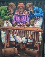 Oil painting on canvas measuring 28 x 37 inches, stretched and framed in a simple black wood frame. Signed "Felipe Ujpan M." in the lower left corner, titled "Musica Indigena" 04 (Indigenous music, 2004) in the lower left corner. The painting depicts 3 men in traje of San Pedro la Laguna, playing the chirimilla (an indigenous Mayan flute), the marimbas, and a flauta. It was painted in 2004. The images below are of the entire painting, followed by close-up photos of different parts. This is a large painting and will be fairly expensive to ship. Some of this extra postage is included in the purchase price.