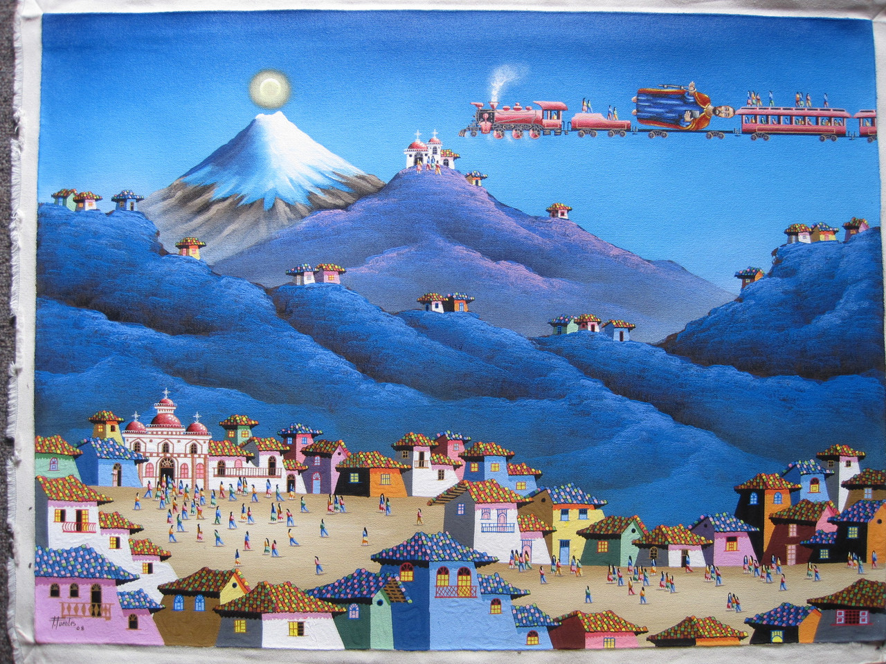 Magical realism is a school of Ecuadorean painting whose founder and major proponent was the painter Gonzalo Endara Crow (1936-1996). Frederico Fuentes was a student and is a follower of Endara Crow. He currently paints and sells his paintings in Quito. He paints in the style of Endara Crow, and many of his paintings reflect themes taken from Endara Crow's paintings. This painting is an original conception of Fuentes picturing a traditional Andean folk dance, and also incorporating other symbolism of Endara Crow.