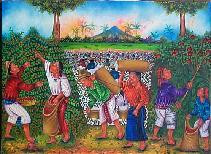 Oil painting on canvas measuring 26 x 19 inches, stretched. Signed lower right "Gaspar Aju Navichoc 2002" and titled lower left "Jornada Cotidiana Atitlan '02". The painting pictures a typical workday in Santiago; all figures are dressed in traditional traje. The first photo shows the entire painting, the next two photos are closeups of each half.