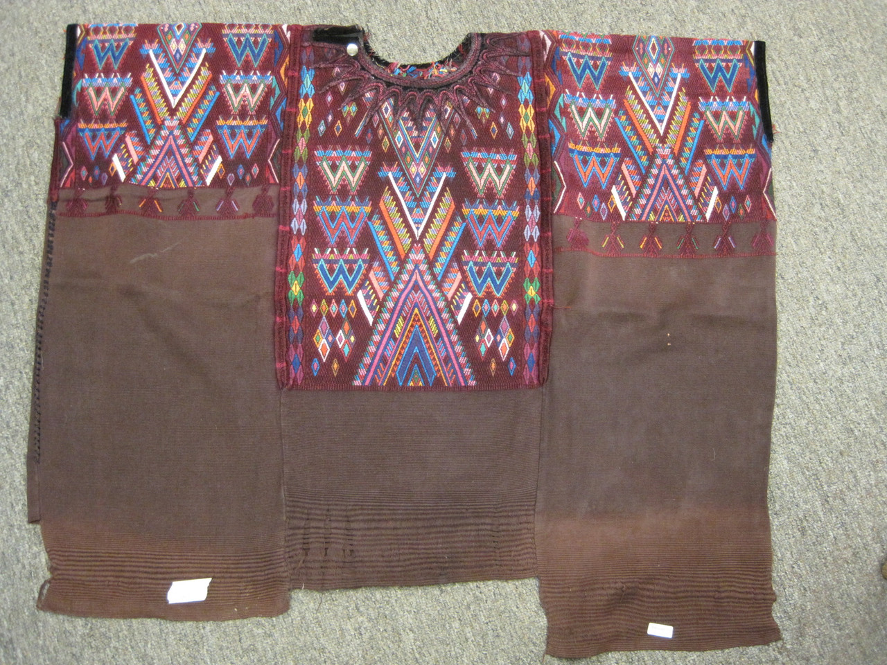This ca. 2000 daily use huipil was hand-woven on a backstrap loom. The foundation fabric is a dark brown cotton. The large geometric designs were added during the weaving process using the technique of supplemental-weft brocading. They were made using mostly cotton threads, and are quite strong and vibrant. It consists of three panels, which have been joined in the areas of the brocading using a fancy randa stitch. All of the lower edges are selvage-finished, though there is some slight looseness in the threads in the lower areas from the manner in which they were removed from the loom. The lengths are also quite uneven, as can be seen in the photos The adornment around the head-hole the traditional Chichicastenango sun design. The side stitching (which makes the huipil into a finished garment to be used) is still present.