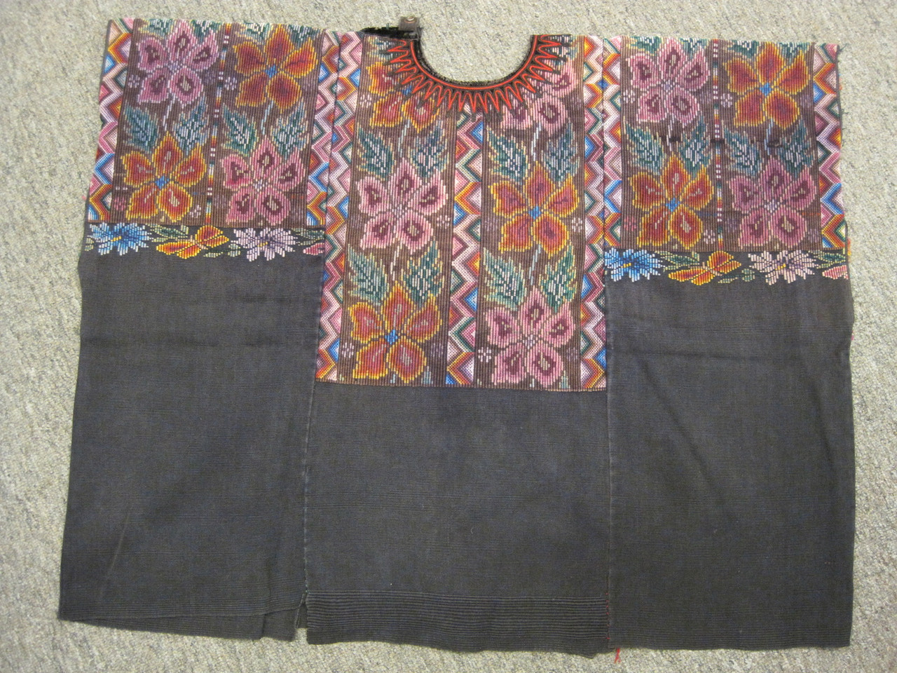 This post 1980 daily use huipil was hand-woven on a backstrap loom. The foundation fabric is a black cotton. The naturalistic floral designs were added during the weaving process using the technique of supplemental-weft brocading. They were made using mostly cotton threads. It consists of three panels, which have been joined in the areas of the brocading. All of the lower edges are selvage-finished, though there is some slight looseness in the threads in the lower areas from the manner in which they were removed from the loom. The lengths are also somewhat uneven. The adornment around the head-hole the traditional Chichicastenango sun design. The side stitching (which makes the huipil into a finished garment to be used) is still present.