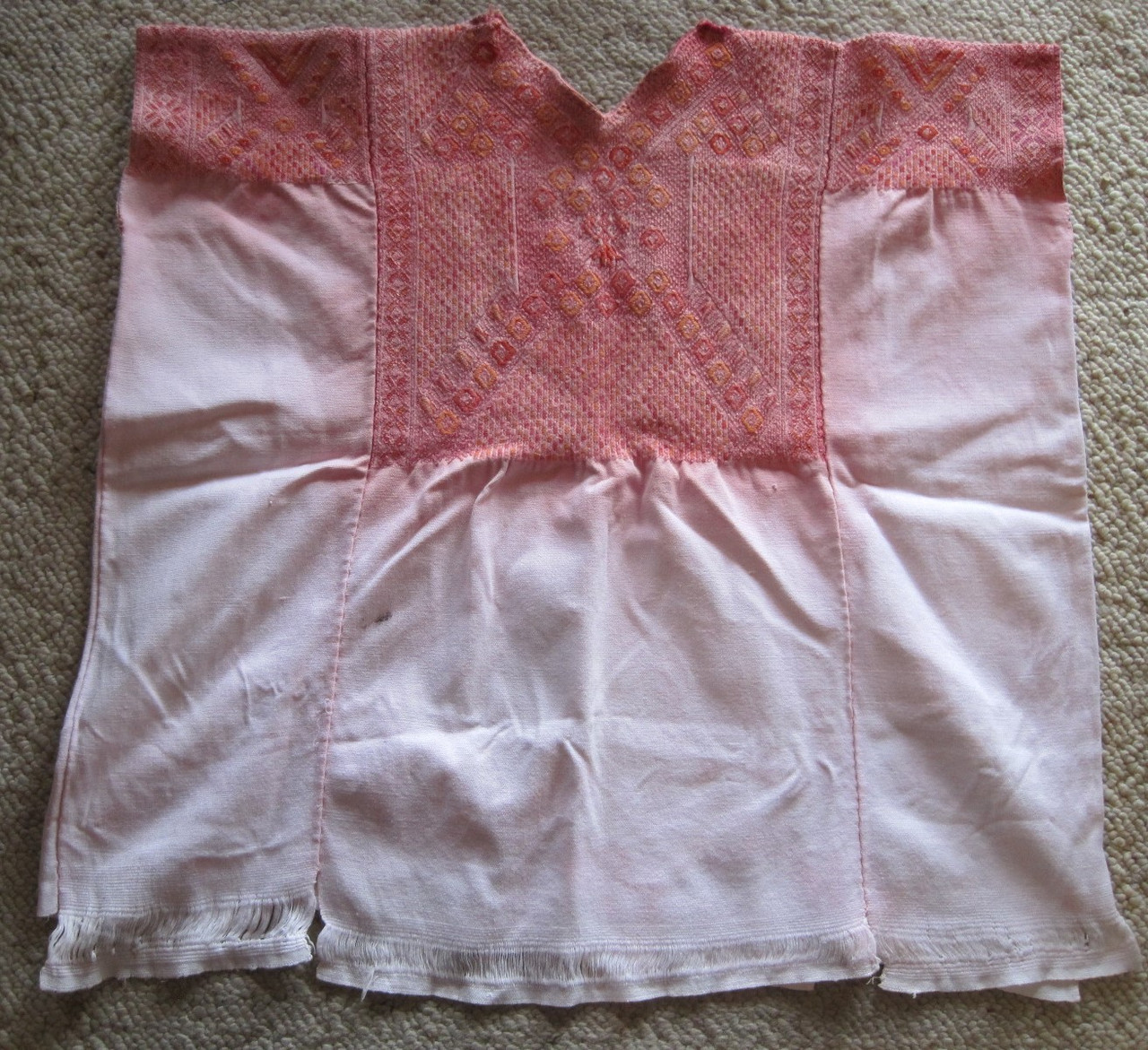 This post-1980 daily use huipil was hand-woven on a backstrap loom. The foundation fabric is white cotton. The double-headed eagles and other geometric designs were added during the weaving process using the technique of supplemental-weft brocading. They are particularly finely woven. The rose pink designs were made using artificial silk (rayon or orlon embroidery floss). Other brocading is of cotton threads. The huipil consists of three panels, seemed at the edges to form the garment. All lower edges are selvage-finished. The adornment around the head- and arm-holes is retained. The side seams, which make the huipil into a finished garment to be used, are still present. Most huipiles from this very traditional Maya village are of two panels; only the cofradia and other ceremonial huipiles are 3 panels wide. According to Krystyna Deuss, cofradia participation ended in 1996, so this garment predates that year.