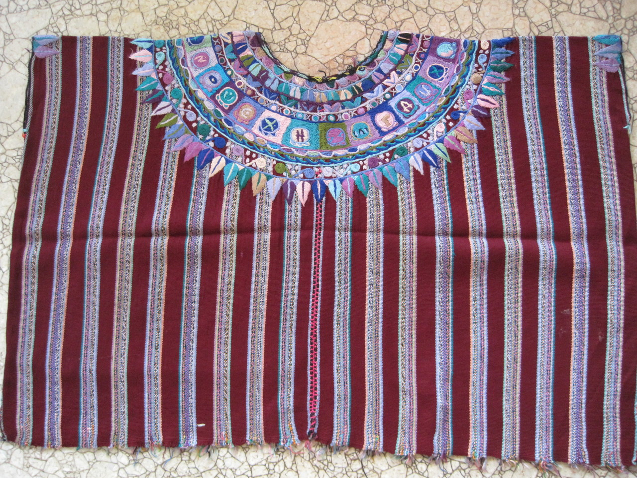 This post-2000 daily use huipil was hand-woven on a backstrap loom. The foundation material is a very soft and supple polished cotton thread called locally aleman, possibly because many years ago the thread was imported from Germany. The designs were all added using needle embroidery after the basic garment was completed. I have been told that this design is called Calendario Maya or Maya calendar. It is beautifully embroidered of fine embroidery floss, mostly cotton but some synthetic artificial silk (rayon or orlon). It consists of two panels, seemed down the center. In this case the randa is comprised of a simple zig-zag stitch. All four lower edges are beautifully selvage-finished. Original adornment around the arm- and head-holes is retained and has the same intricate beauty. The stitching under the arm-holes, which makes the garment finished for use, is still present.