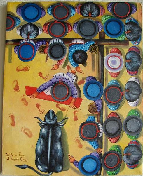 This is an oil painting on stretched canvas, and measures approximately 16 x 20 inches. It is stretched but not framed, and depicts a "Vista del pajaro" (view of the bird) of a traditional Maya bull fight. The watchers all are wearing traditional costumes of various of the villages around Lake Atitlan. The painting is signed in the lower left corner "J Francisco Cumez", whose paintings are sold in art galleries around Lake Atitlan. This painting was recently purchased in Panajachel, and is in Very Good condition.