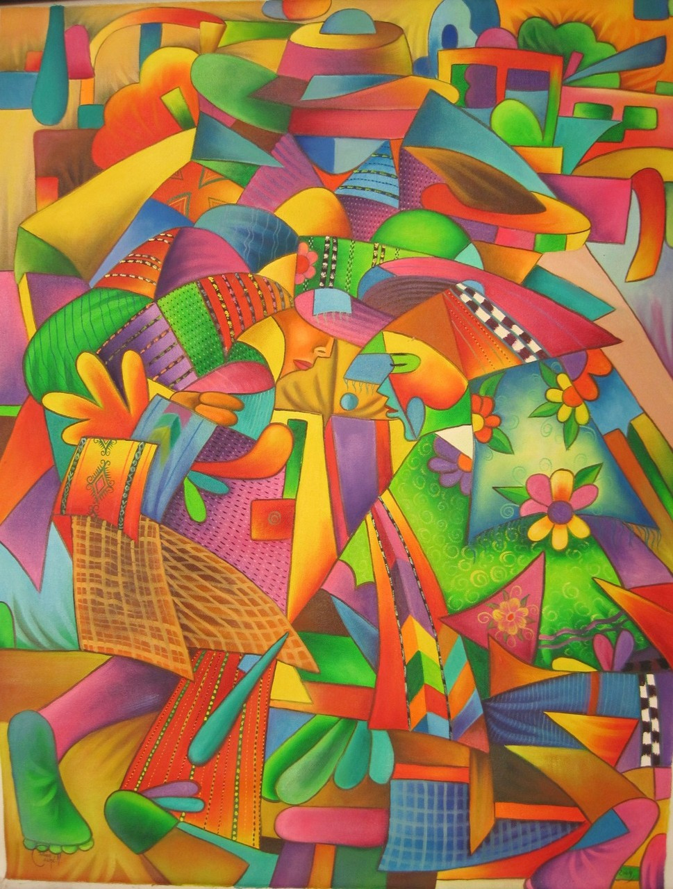 Oil painting on canvas measuring 32 x 24 inches, unstretched. The painting will be mailed rolled in a hard tube. Signed "Julian Coche M." in the lower left corner, and dated 2009 in the lower right. The painting depicts a Mayan couple dancing a very traditional Guatemalan dance This painting was purchased in January 2010 in the Mendoza family gallery in San Juan. Different photos were taken in different lighting, actual color is somewhat in between.