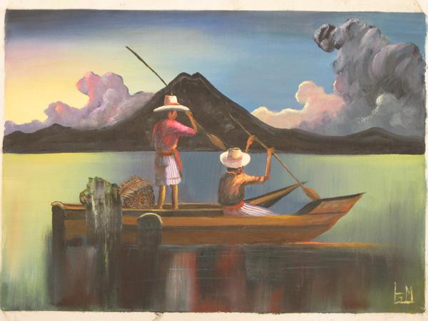 This is an oil painting on unstretched canvas, and has an image size measuring approximately 21 x 15 inches. It is not stretched and not framed, and will be mailed rolled in a hard tube. The painting depicts two Maya men in a canoe, working on Lake Atitlan with Volcan San Pedro in the background. It is signed in the lower right corner with an LGM monogram for Lorenzo Gonzalez Mendoza, a resident of Solola whose paintings are sold in art galleries around Lake Atitlan. Lorenzo is a highly respected contemporary painter, whose son Otto also paints. This painting was recently purchased in Santiago Atitlan, and is in Very Good condition.