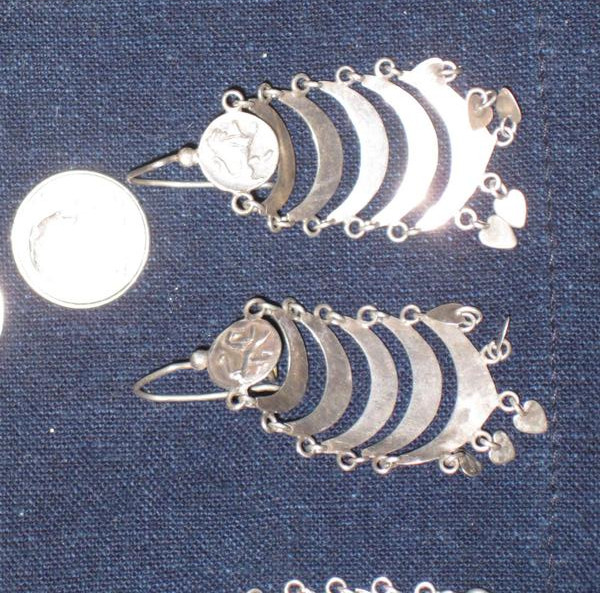 Old Coin Silver earrings with 5 dangling crescents and 5 dangling hearts