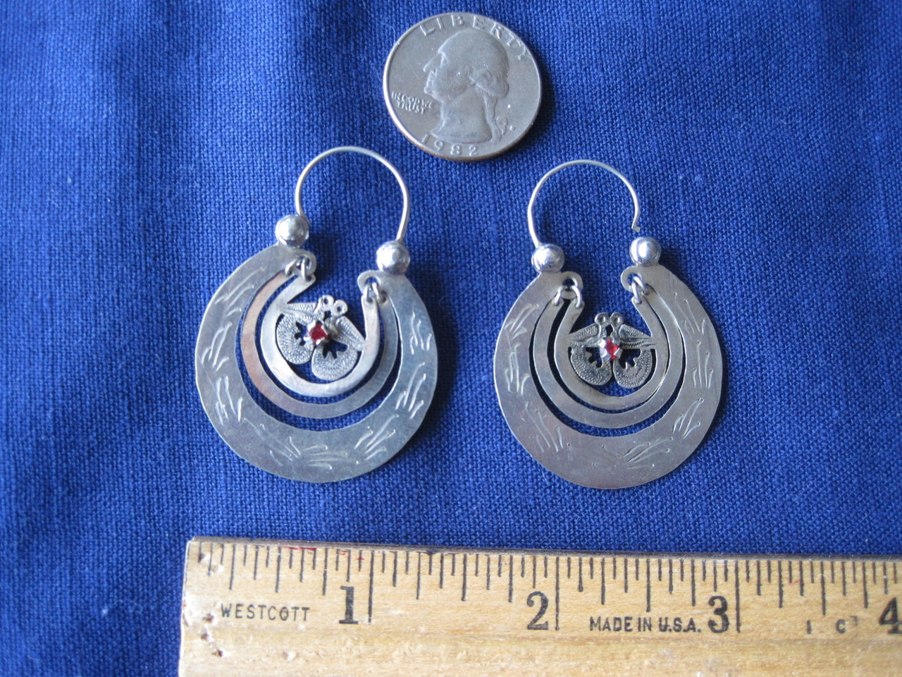 These earrings are probably coin silver (about 800 fine) since they are not marked, and are somewhat older. There is some etching around the larger loop, and on the twin quetzal bird figures in the center. These earrings are of heavier gauge silver than some of the others. Maximum diameter is 1.3 inches, total length top of ear wire to bottom is 1.9 inches. Photographs show both sides.