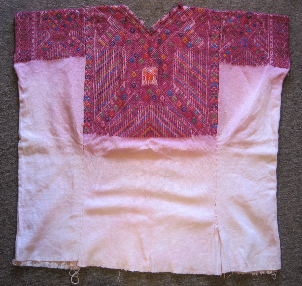 This post-1980 woman's huipil was hand-woven on a backstrap loom. The foundation fabric is very fine white cotton. The finely-brocaded geometric designs were added during the weaving process using the technique of supplemental-weft brocading. All brocading is of cotton and artificial silk. The huipil consists of three panels, seemed at the edges to form the garment. Three of the lower panel edges are very nicely selvage-finished, the other three have short warp fringes. The original adornment around the head- and arm-holes is retained. The stitching under the arm-holes is still present, so that the garment can be used as originally intended. Most huipiles from this very traditional Maya village are of two panels; only the cofradia and other ceremonial huipiles are 3 panels wide. According to Krystyna Deuss, cofradia participation ended in 1996, so this garment predates that year.