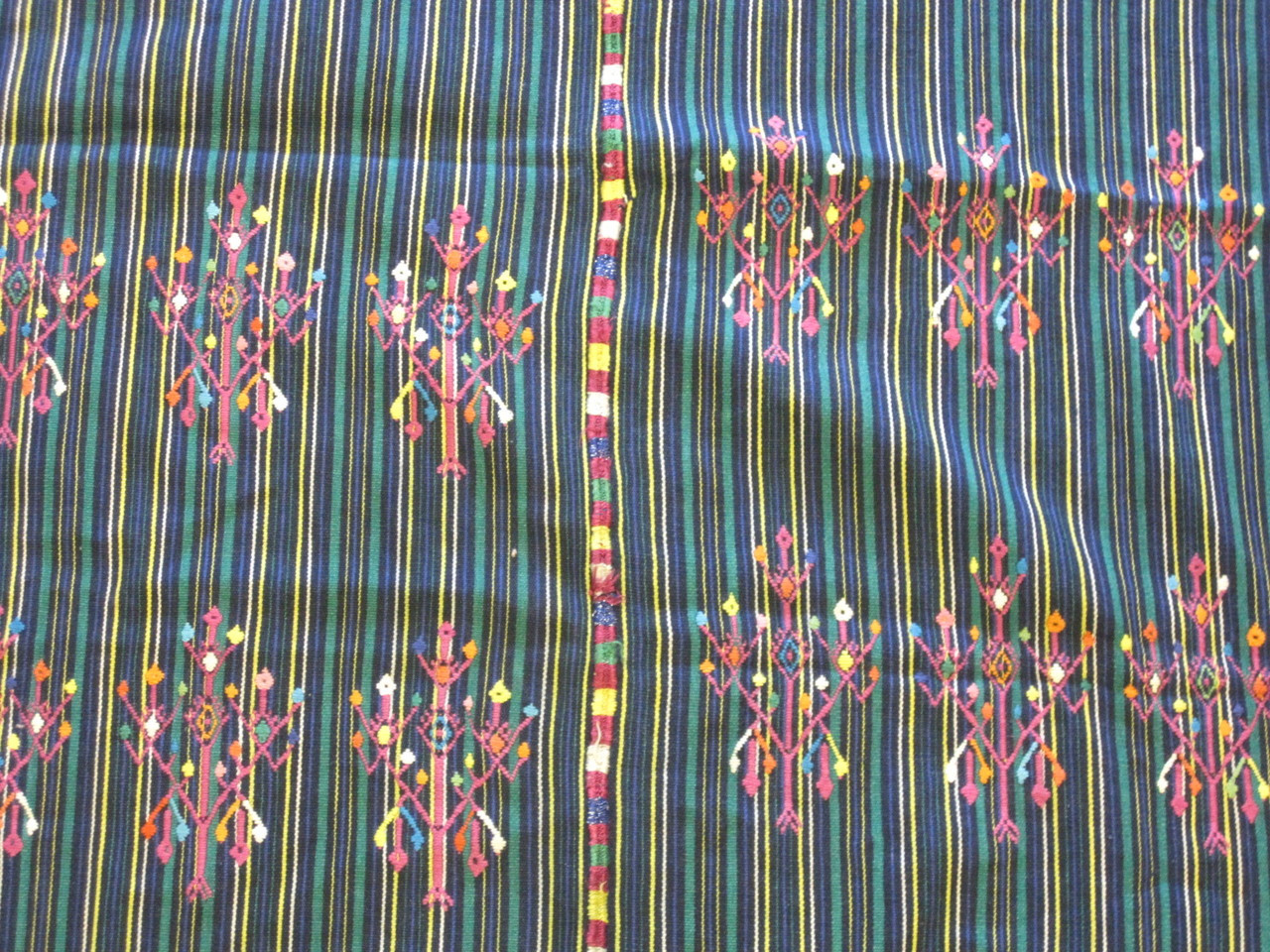 This is a traditional tzute from Nahuala. It probably dates from the 1980s. It was handwoven on a backstrap loom in two panels, then joined with a simple overcast stitching down the center. Two edges are selvage-finished, two are hemmed. Dimensions are 38 inches wide and approximately 38 inches long. Background fabric is cotton of multi-colored stripes, including indigo. The brocaded designs are a mixture of polished cotton, mish cotton, and artificial silk (orlon embroidery floss). I purchased this tzute from an old woman from Nahuala in 2015, and she told me it was for use at the cofradia ceremony as a table cover.