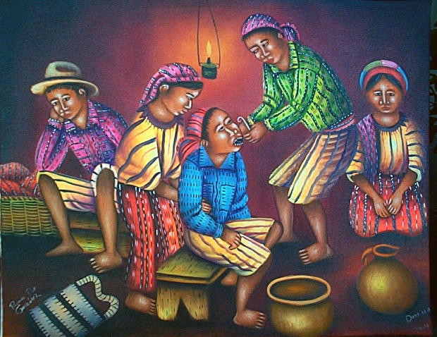 Pascual pur Gonzalez is a contemporary Maya painter who lives in Santiago Atitlan. Curanderos or doctors are a respected segment of traditional Mayan culture. They have traditionally performed their services using a mixture of religion, witchcraft, herbal medicines and common sense. As can be imagined, traditional dental services were fairly primitive. Recently, a number of American and Canadian doctors have visited the Lake Atitlan region of southern Guatemala as volunteers, providing free or very low cost medical aid to the peoples. These surgeons can perform more complicated dental surgical procedures than the local doctor, probably with considerably less pain.