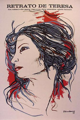 Full-size original silkscreen Cuban Movie poster for the film "Retrato de Teresa" directed by Pastor Vega. Artist is Servando Cabrera Moreno, dated 1979. Silkscreen in 4 colors on cream-colored paper. Published by ICAIC, the Cuban Film Institute.