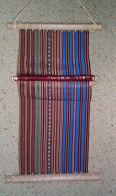 This sample loom was purchased in the mid-1990s from a textile museum in Antigua, Guatemala. It was woven by weavers from Solola, and shows the complete parts of the loom and the designs for textiles woven in Solola.