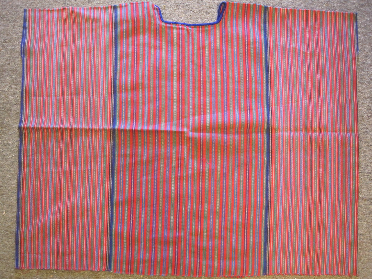 This ca. 1980's daily use huipil is from the Tzutujil Maya village of San Antonio Palopo, located on Lake Atitlan. It was hand-woven on a backstrap loom. The foundation fabric is cotton. The huipiles of San Antonio are unusual in having no brocaded designs, just the narrow warp stripes. The huipil consists of three panels, seemed with a very fine stitch. All of the lower edges are nicely finished. The adornment around the head- and arm-holes is retained, and the stitching under the arm holes is still present. The huipil still exists as originally worn.