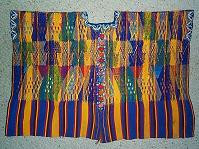This post-1980 daily use huipil was hand-woven on a backstrap loom. The foundation fabric is cotton, of multi-colored stripes. The colorful designs were added during the weaving process using the technique of supplemental-weft brocading. They were made using mish cotton and polished cotton. The huipil consists of two panels, seemed down the center and decorated with a fancy randa stitch. All lower edges are selvage-finished, though those on one side are somewhat loose from the removal of the batten when the weaving was terminated. The adornment around the head- and arm-holes is retained. The side stitching, which makes the huipil into a finished garment to be used, has been removed.