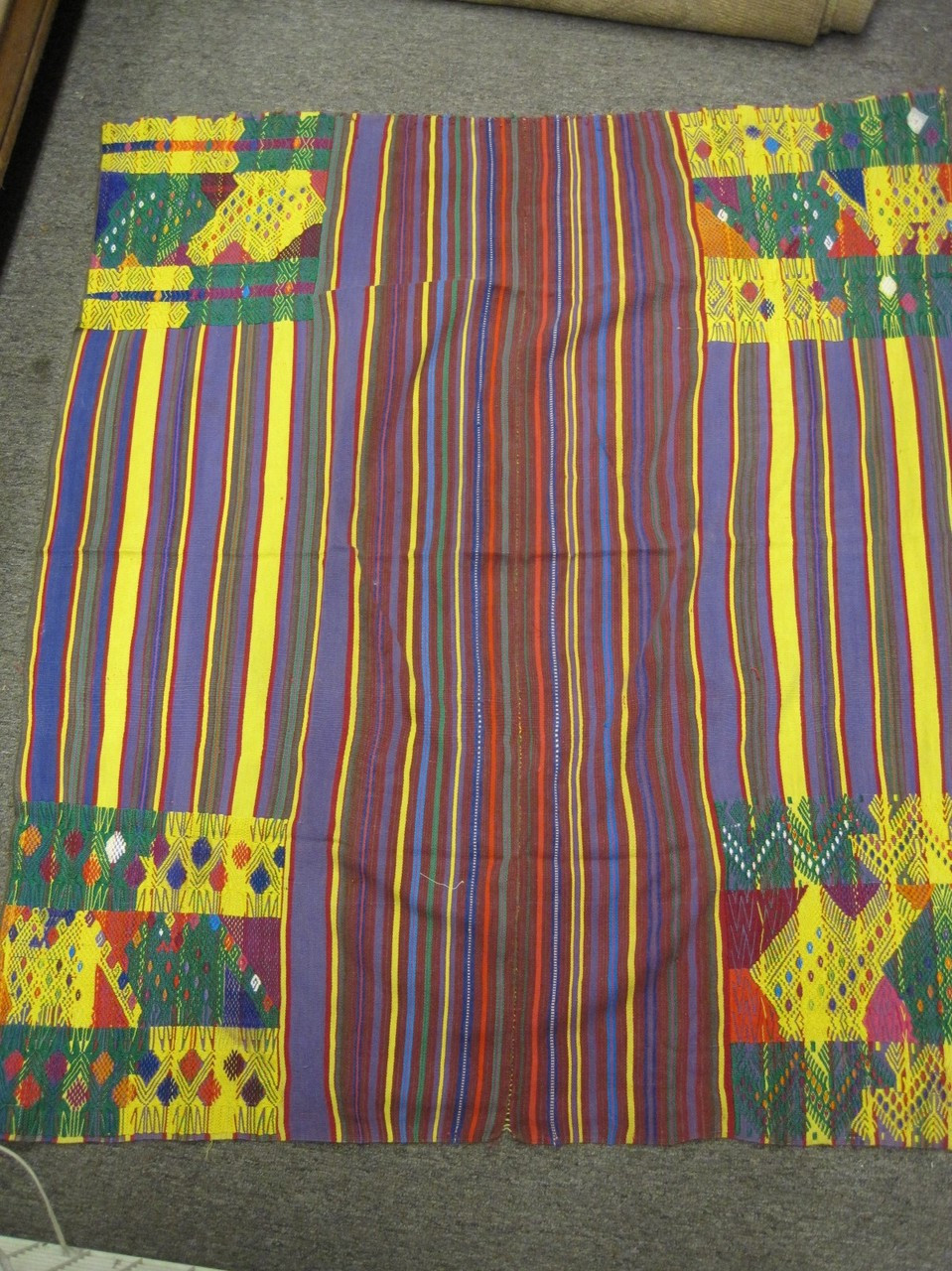 This is a traditional woman's cargador or carrying cloth tzute from San Juan Sacatepequez. It dates from the 1980s. It was handwoven on a backstrap loom in two panels, then joined with a simple randa down the center. All four edges are selvage-finished. Dimensions are 43 inches wide and approximately 49 inches long, though the shape is somewhat irregular. Background fabric is cotton of multi-colored stripes. The brocaded designs are a combination of cotton and synthetic threads. Condition is Very Good, perhaps there are a few loose threads, since this is a used tzute. There is also some light soil and looseness in the weave where the weaving was ended. The photos below show the lower right corner and lower left corner respectively.