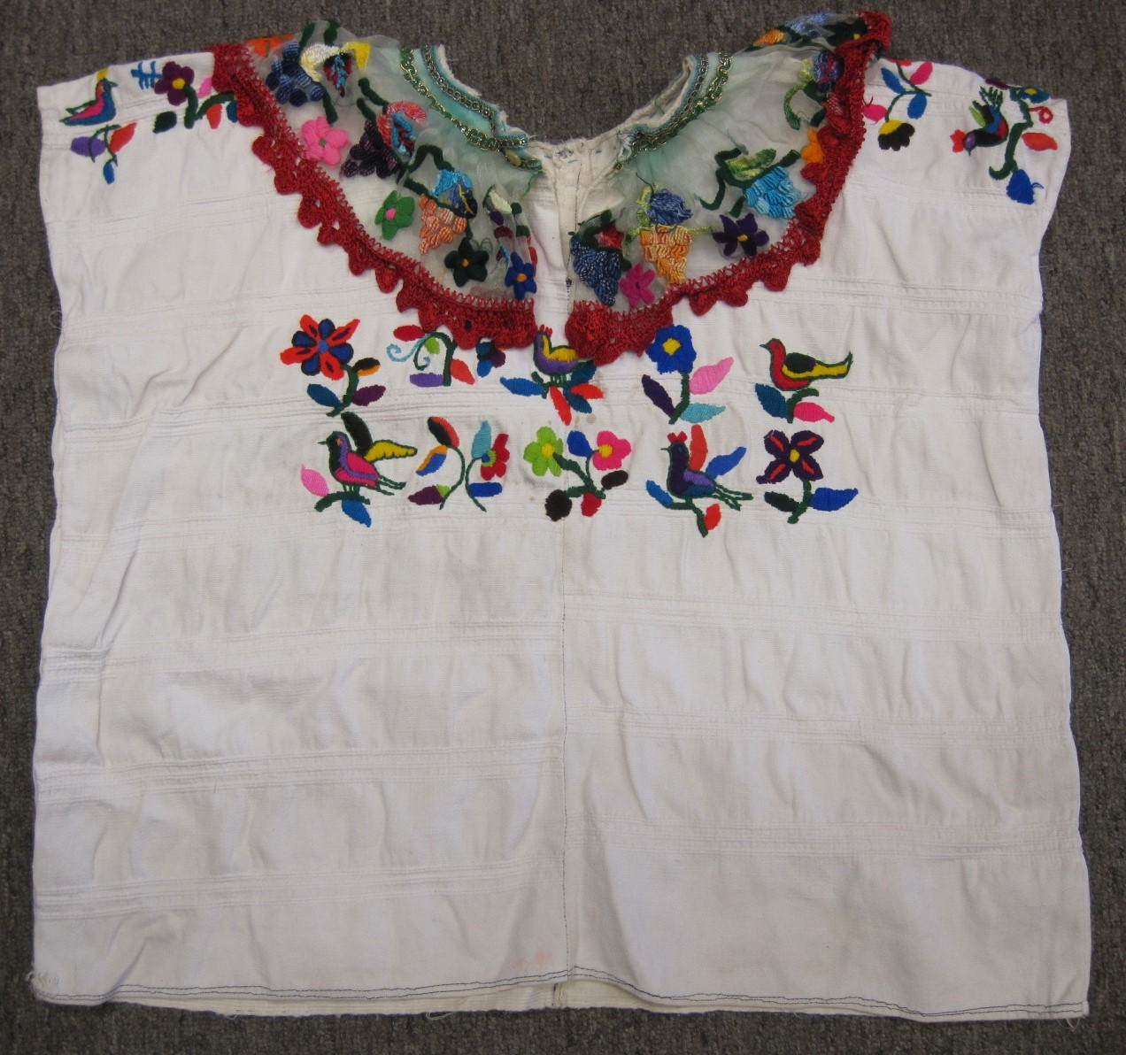 This traditional post 2000 San Pablo huipil was hand-woven on a backstrap loom in 2 panels, the white foundation cotton material exhibiting strong weft ridging due to variable thickness of the weft threads. The fancy lace collar of commercial fabric was added after the head-hole was cut, and the decoration around the arm-holes applied by hand. All embroidery on this more contemporary huipil is by hand.