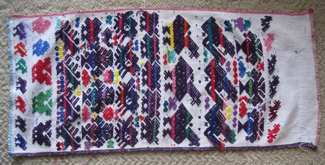 This cofradia small tzute from San Pedro Sacatepequez dates from post 2000; various cofradia are still active in San Pedro, and this cloth was purchased in 2019. It was woven in a single panel on a backstrap loom. The decoration was added using supplemental weft brocading. All four edges are nicely selvage-finished. These small utility cloths were used for a variety of functions: as head coverings, as servilletas, to wrap around and hold candles in the procession, etc.