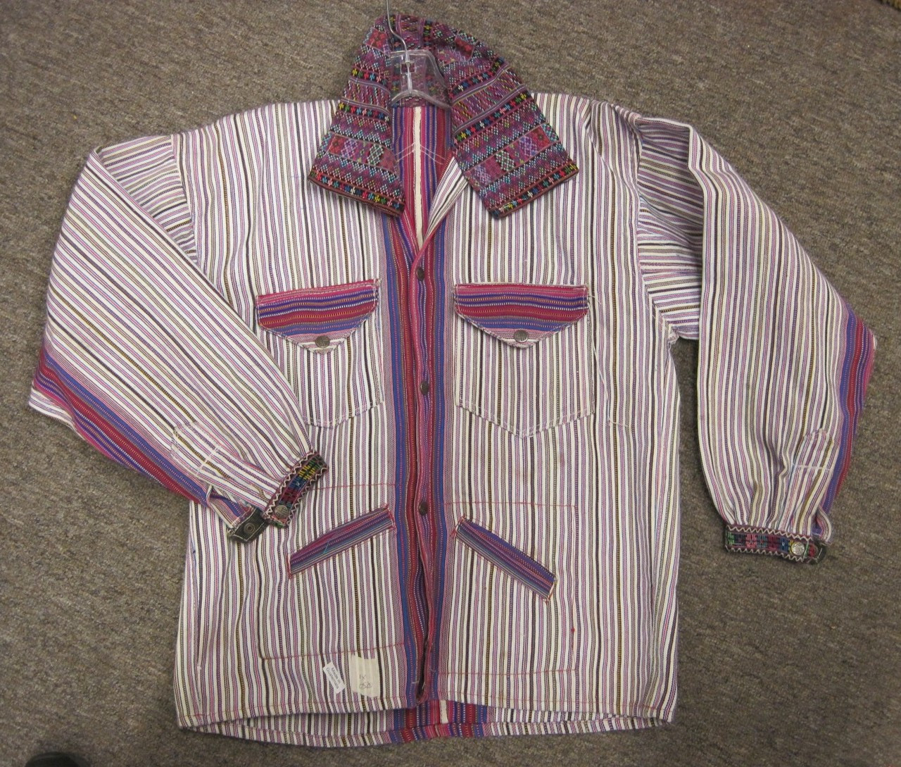 The women of the village of Todos Santos Chuchumatanes make the clothing of their menfolk in the same way they make their own clothing. The striped fabric is hand-loomed on a backstrap loom, as are the heavily brocaded pieces which make up the collar and cuffs. All are then cut and sewn into a western-style shirt, which is usually closed up the front with metal pressure snaps. This style of shirt has been used for at least 50 years, but this garment is of post 2000 manufacture.