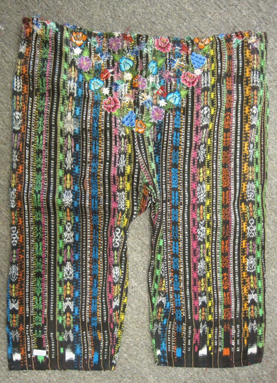 This pair of man's pants is from Solola. They were handwoven in four panels on a backstrap loom, and are of 100% cotton. This type of pantalones is of the style traditional worn by the men of Solola. The floral embroidery designs were added by machine.