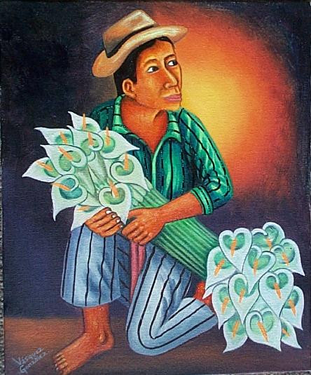 This painting is oil on stretched canvas, and measures 9x11 inches. It is signed in the lower left. It is a portrait of a man from San Pedro la Laguna selling lillies.